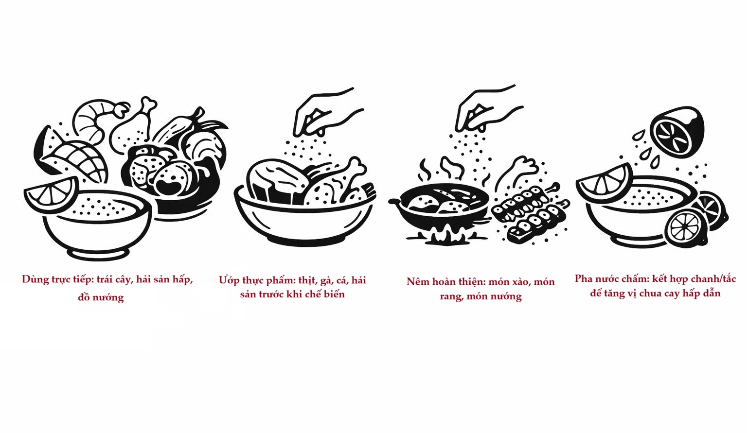 - Dùng trực tiếp: trái cây, hải sản hấp, đồ nướng
